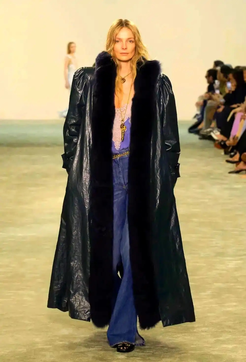 在Brandon Maxwell的設(shè)計(jì)中,牛仔元素與動物紋理的結(jié)合尤為突出。他巧妙地運(yùn)用了各種材質(zhì)與元素的融合,創(chuàng)造出既具個性又不失時尚感的成衣系列。這一系列作品不僅展示了Brandon Maxwell對時尚的一次全新探索,更體現(xiàn)了他對自我風(fēng)格的極致追求。